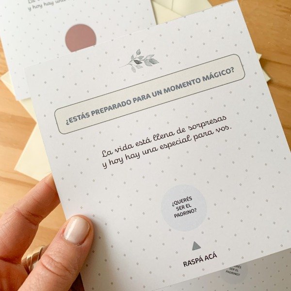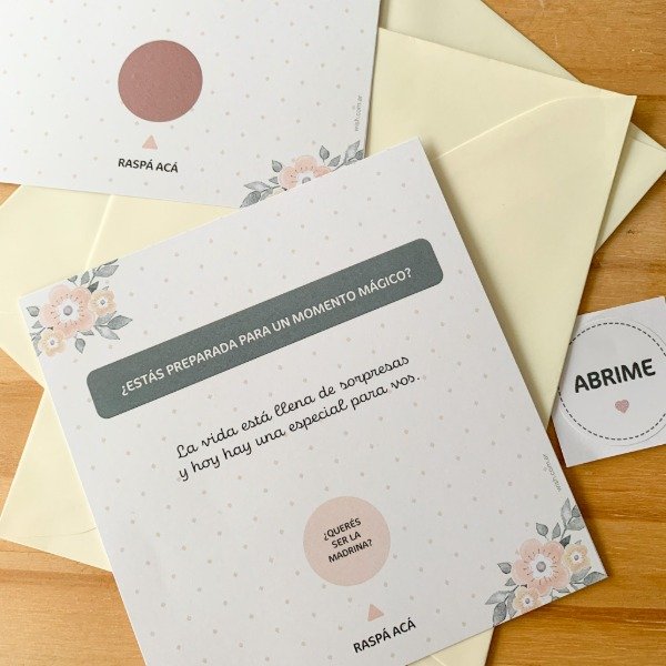 Tarjetas impresas en papel opalina con raspadita para raspar color rosa + sobre crema + sticker de cierre